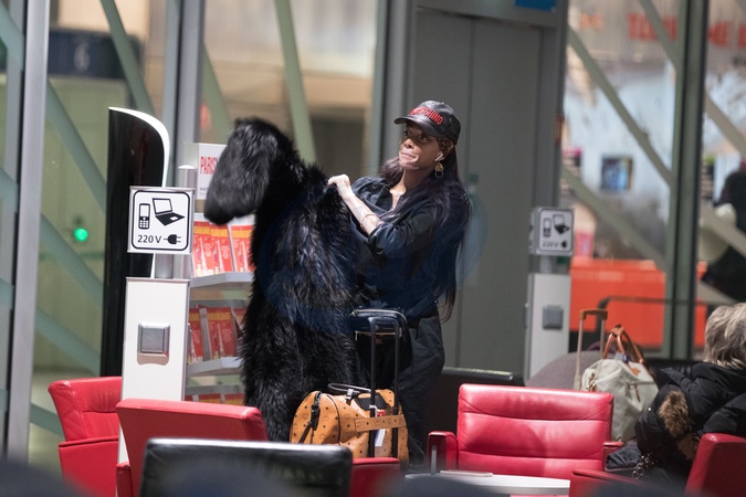 Winnie Harlow w czarnym futrze, maluje sie na lotnisku