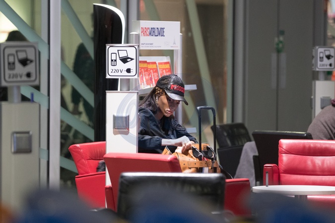 Winnie Harlow w czarnym futrze, maluje sie na lotnisku