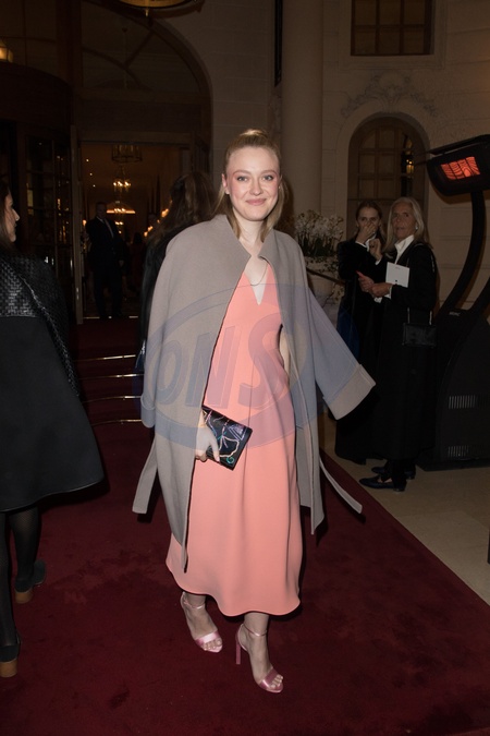 Dakota Fanning w rozowej, pudrowej sukience i szarym plaszczu wraca z pokazu mody