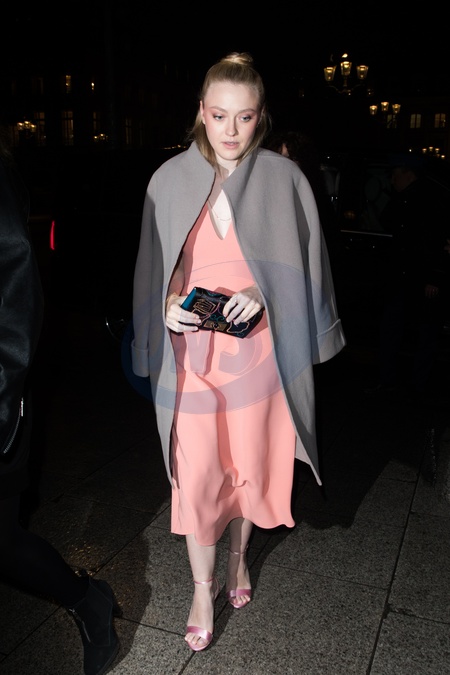 Dakota Fanning w rozowej, pudrowej sukience i szarym plaszczu wraca z pokazu mody