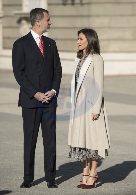 Krolowa Letizia w wezowej sukience i krol Filip przyjmuja pare prezydencka z Peru