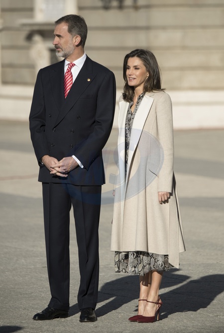 Krolowa Letizia w wezowej sukience i krol Filip przyjmuja pare prezydencka z Peru