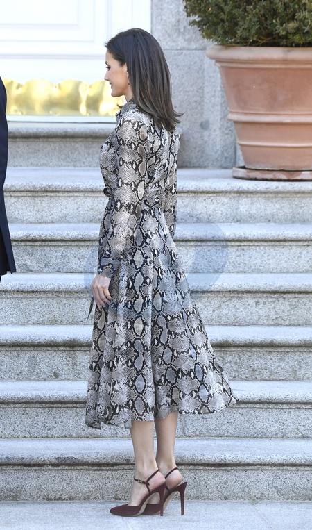 Krolowa Letizia w wezowej sukience i krol Filip przyjmuja pare prezydencka z Peru
