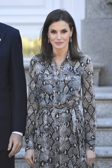 Krolowa Letizia w wezowej sukience i krol Filip przyjmuja pare prezydencka z Peru