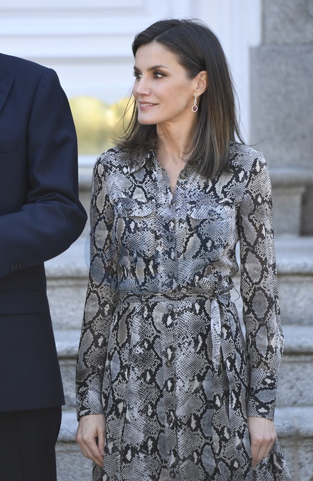 Krolowa Letizia w wezowej sukience i krol Filip przyjmuja pare prezydencka z Peru