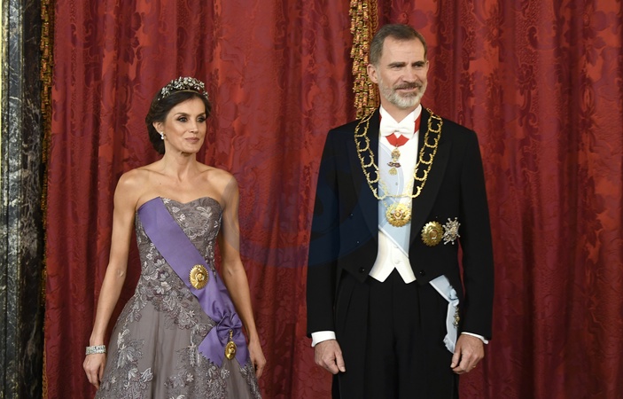 Krolowa Letizia w balowej sukni i w diademie na przyjeciu dla pary prezydenckiej z Peru