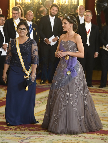 Krolowa Letizia w balowej sukni i w diademie na przyjeciu dla pary prezydenckiej z Peru