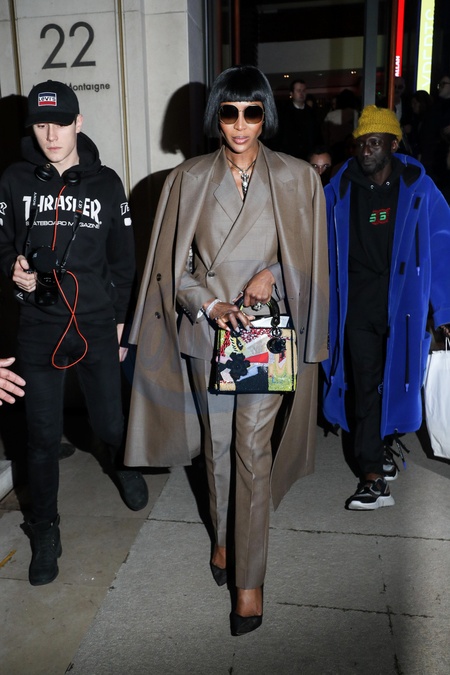 Naomi Campbell w eleganckim plaszczu i z kolorowa torebeczka