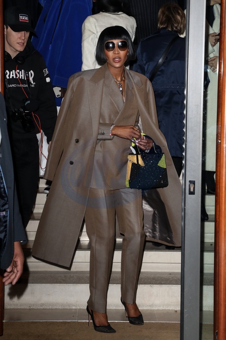 Naomi Campbell w eleganckim plaszczu i z kolorowa torebeczka