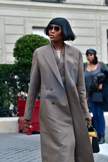 Naomi Campbell w eleganckim plaszczu i z kolorowa torebeczka