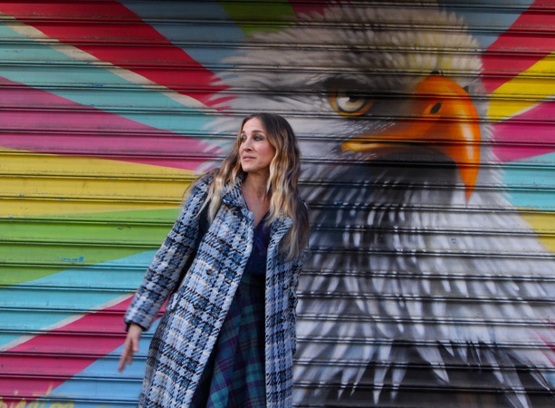 Sarah Jessica Parker w kraciastym plaszczu