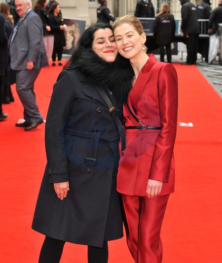 Rosamunde Pike w czerwonym garniturze na premierze Radioactive