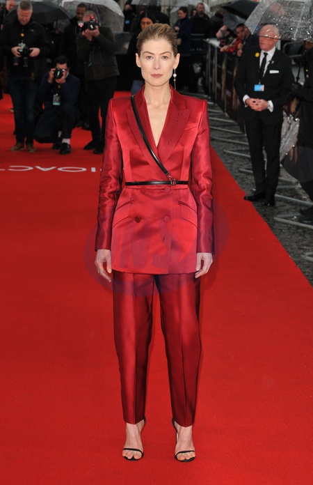 Rosamunde Pike w czerwonym garniturze na premierze Radioactive