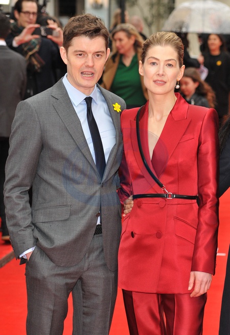 Rosamunde Pike w czerwonym garniturze na premierze Radioactive