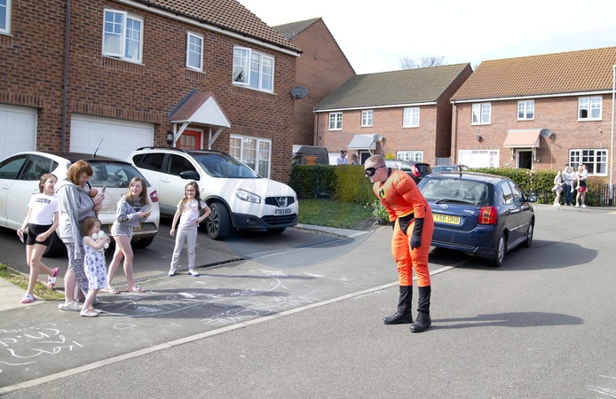 Superbohater Iniemamocni podczas biegania probuje rozweselic dzieci
