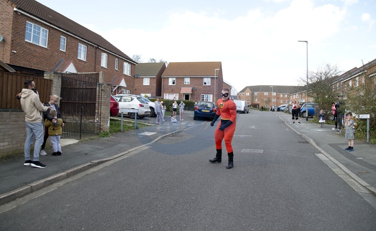 Superbohater Iniemamocni podczas biegania probuje rozweselic dzieci