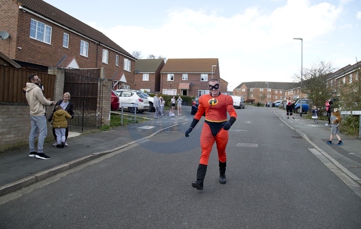 Superbohater Iniemamocni podczas biegania probuje rozweselic dzieci