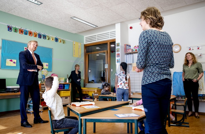 Krol Willem Alexander podczas wizyty w szkole podstawowej w Hadze