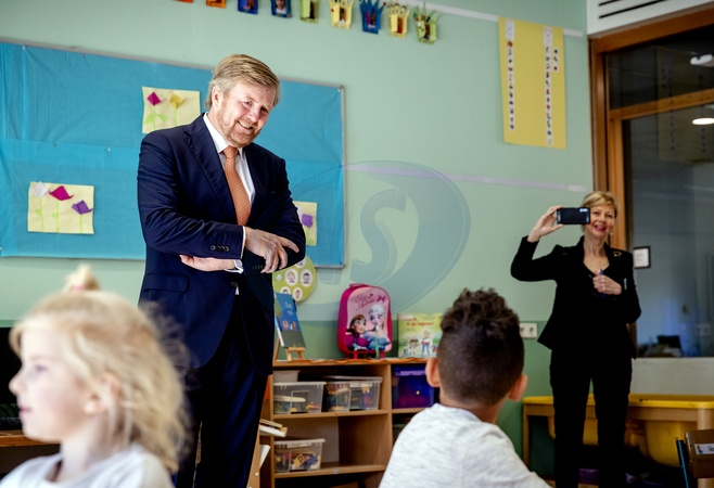 Krol Willem Alexander podczas wizyty w szkole podstawowej w Hadze