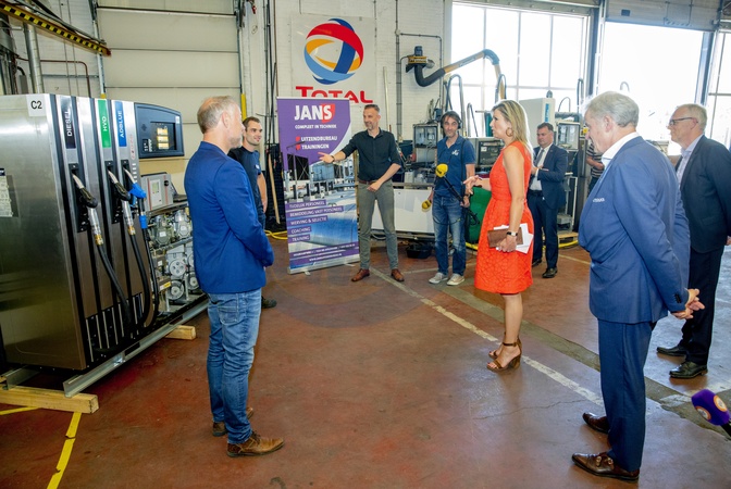 Krolowa Maxima w pomaranczowej sukience, podczas wizyty w Hamer Apeldoorn