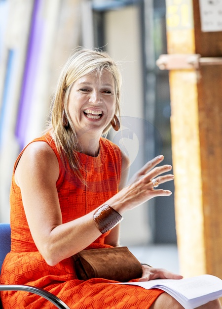Krolowa Maxima w pomaranczowej sukience, podczas wizyty w Hamer Apeldoorn
