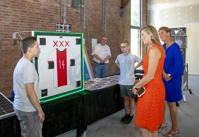 Krolowa Maxima w pomaranczowej sukience, podczas wizyty w Hamer Apeldoorn