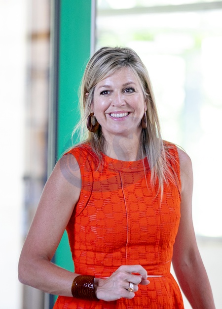 Krolowa Maxima w pomaranczowej sukience, podczas wizyty w Hamer Apeldoorn