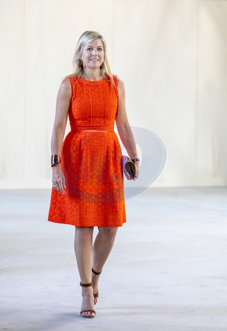 Krolowa Maxima w pomaranczowej sukience, podczas wizyty w Hamer Apeldoorn