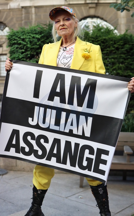 Vivienne Westwood w wielkiej klatce protestuje przeciwko ekstradycji Juliana Assanga
