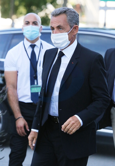 Carla Bruni w spodnium i Nicolas Sarkozy przed budynkiem tv
