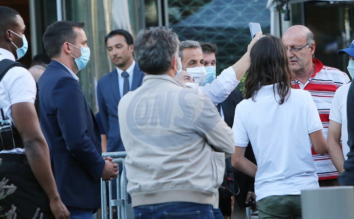 Carla Bruni w spodnium i Nicolas Sarkozy przed budynkiem tv