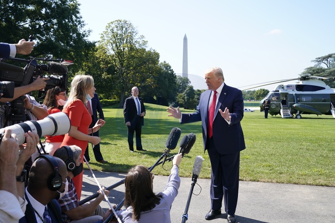 Donald Trump rozmawia z dziennikarzami przed wyjazdem do Minessoty