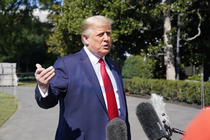 Donald Trump rozmawia z dziennikarzami przed wyjazdem do Minessoty