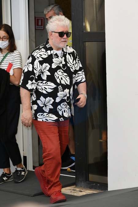 Wenecja - Tilda Swinton w neonowym garniturze i Pedro Almodovar na photocall