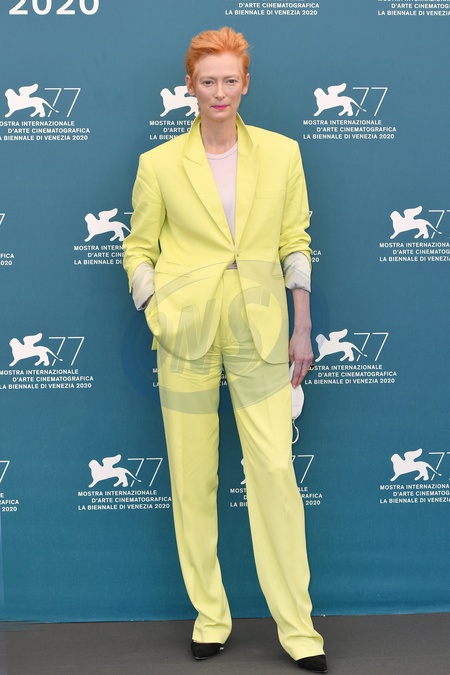 Wenecja - Tilda Swinton w neonowym garniturze i Pedro Almodovar na photocall