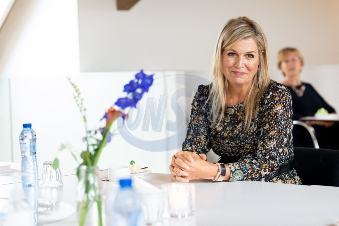 Krolowa Maxima we wzorzystej sukni i w szerokim pasie