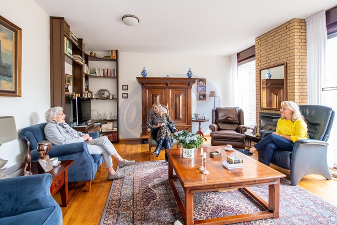 Krolowa Maxima we wzorzystej sukni i w szerokim pasie