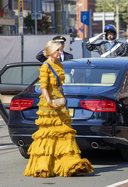 Krolowa Maxima w miodowej, falbniastej sukni