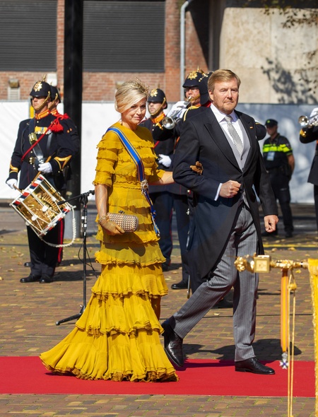 Krolowa Maxima w miodowej, falbniastej sukni