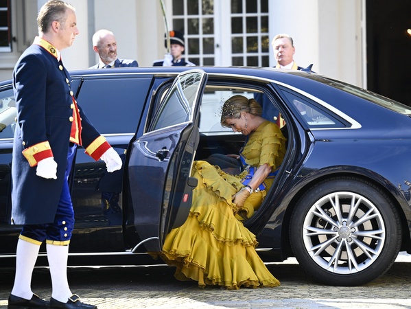 Krolowa Maxima w miodowej, falbniastej sukni