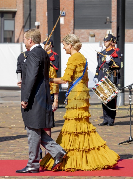 Krolowa Maxima w miodowej, falbniastej sukni