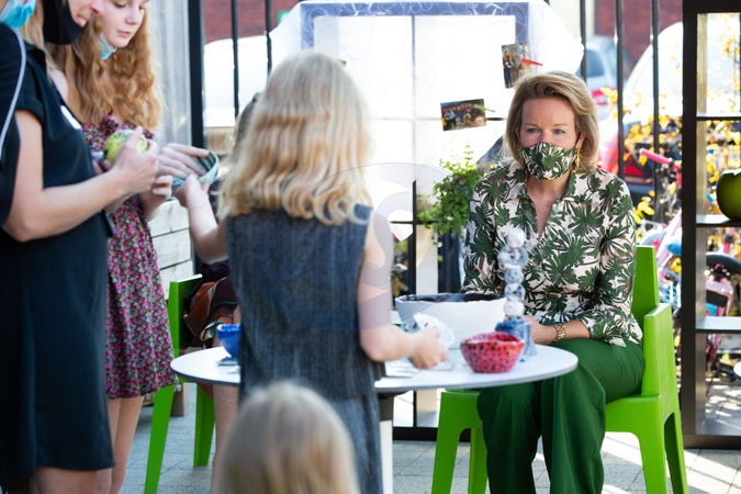 Krolowa Matylda w koszuli w palmy spotkala sie z dziecmi