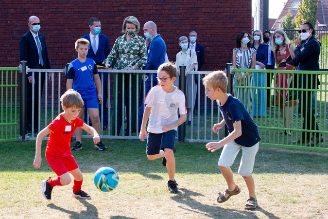 Krolowa Matylda w koszuli w palmy spotkala sie z dziecmi