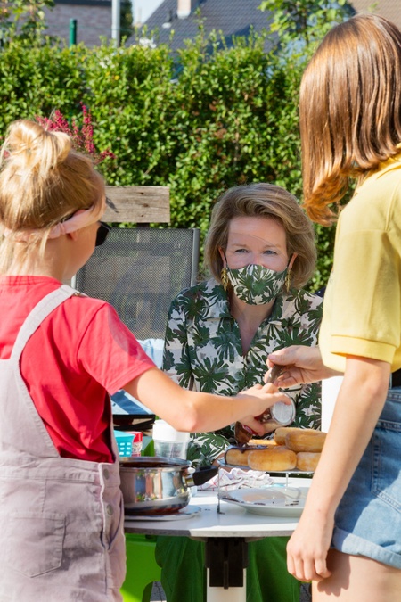 Krolowa Matylda w koszuli w palmy spotkala sie z dziecmi