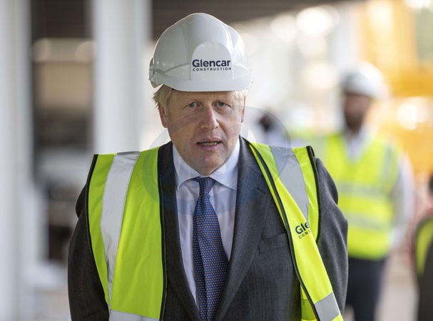 Boris Johnson w kaloszach i w kasku na placu budowy
