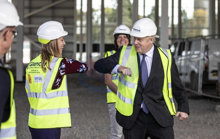 Boris Johnson w kaloszach i w kasku na placu budowy