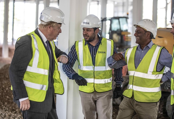 Boris Johnson w kaloszach i w kasku na placu budowy