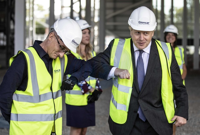 Boris Johnson w kaloszach i w kasku na placu budowy