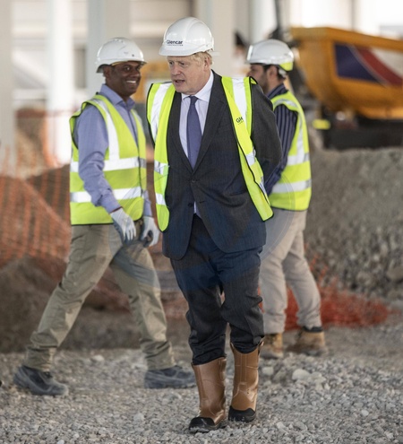 Boris Johnson w kaloszach i w kasku na placu budowy