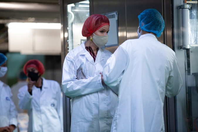 Krolowa Matylda w czepku i w fartuchu podczas wizyty w firmie mleczarskiej